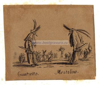 Два оригинальных листа и лист копии есть в коллекции Британского музея! Техника: офорт. Художник: неизв. Гравёр: неизв. Автор сюжета: Жак Калло (Jacques Callot (ок.1592-1635)). Место издания: неизв. Год издания: к. 19 в.? Размер листа: 11х8 см. |